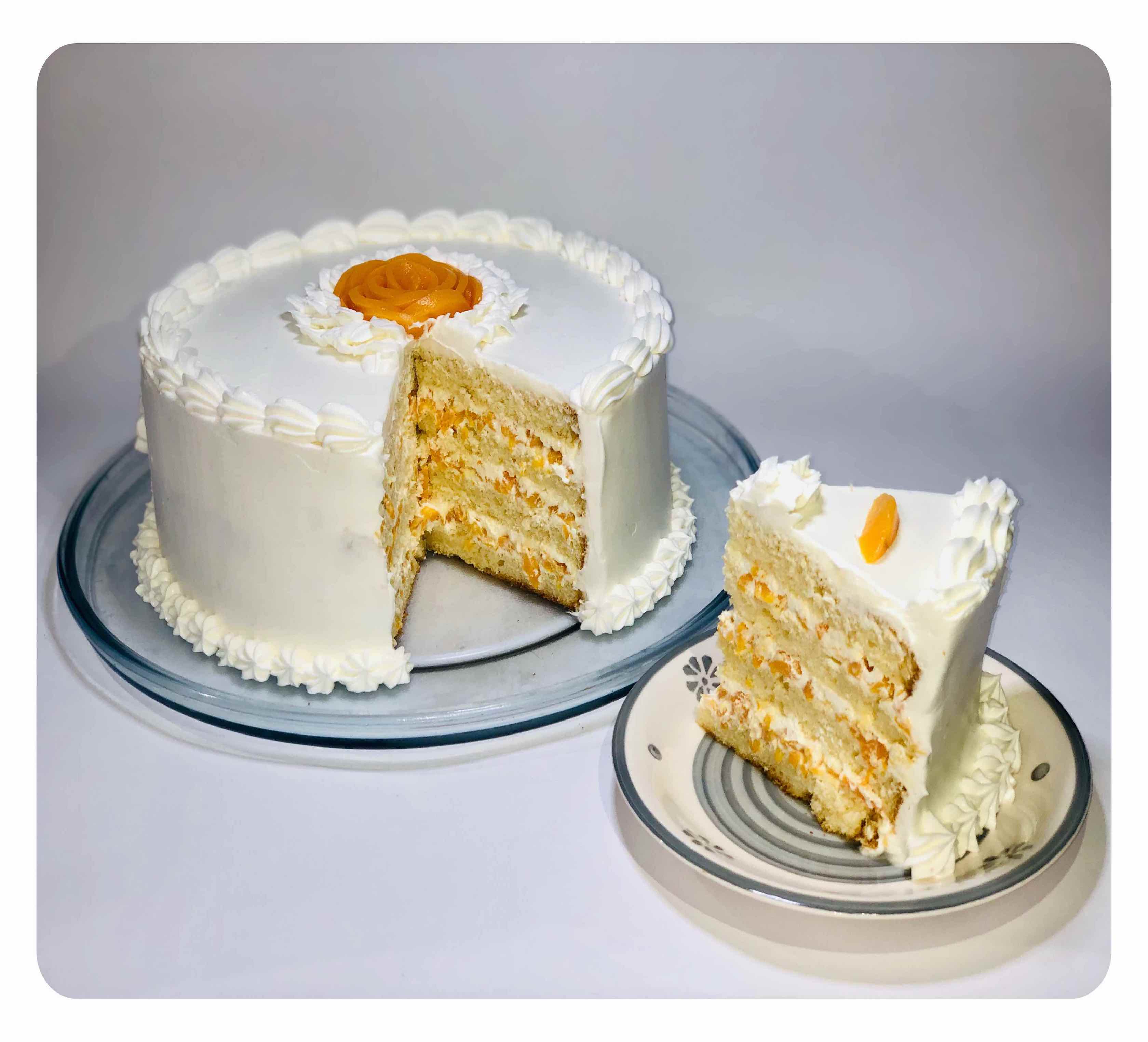 Exquisita torta a base de un esponjoso biszcocho de vainilla, relleno con trozos de duraznos y cubierta de una suave crema chantilly.
